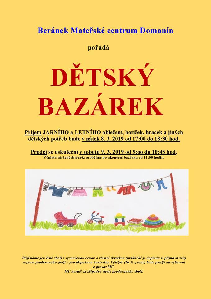 Příjem věcí probíhá 8.3, prodej následující den. Přijímáme oblečení, hračky, dětské příslušenství aj.